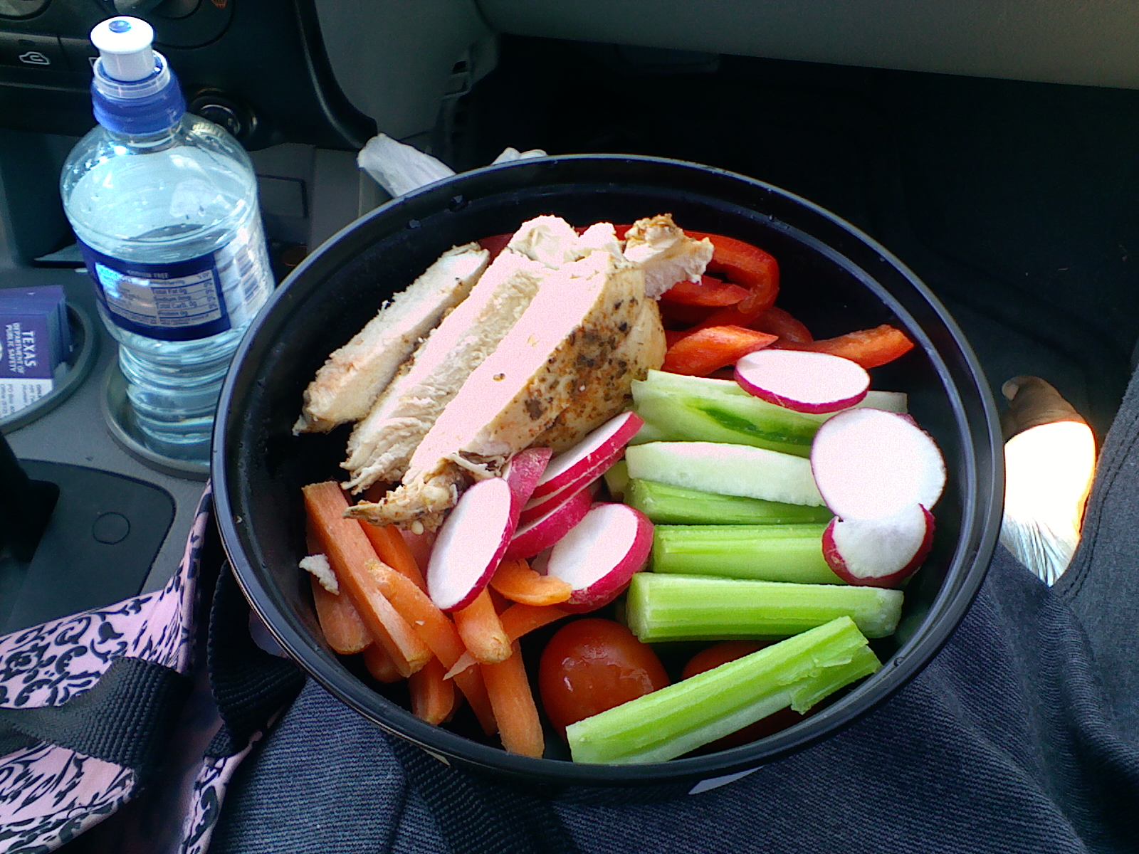 Here is an example of a meal my husband tossed together for our evening. This was a couscous/quinoa mix with veggies and reheated baked chicken thighs. It was fast and filling.